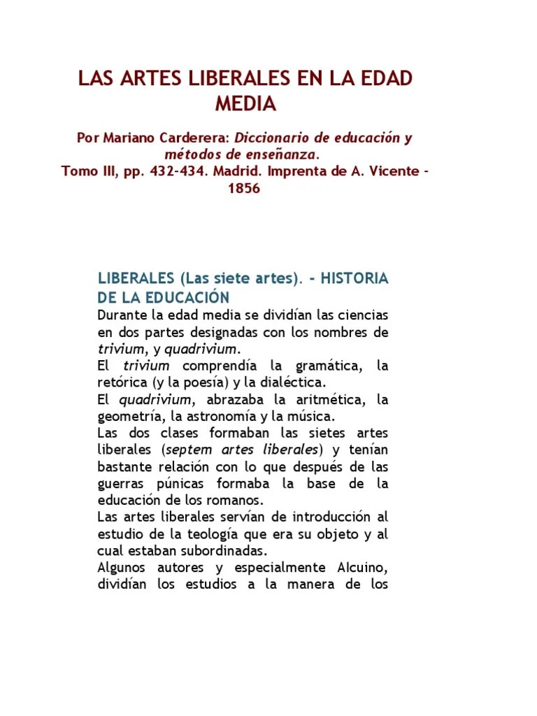 Pues la geometría ha enseñado al hombre la medida, la ponderación y los pesos de toda clase de cosas sobre la tierra. Sería discutible decir si el orden propuesto es justo o no. Es por eso que en estos. 20.05.2019 · el concepto de arte liberal, heredado de la antigüedad clásica, hace referencia a su cultivo por hombres libres en oposición a las artes serviles. 06.02.2019 · gramática una de las siete artes y ciencias liberales que forma, junto con la lógica y la retórica, una tríada dedicada al cultivo de la lengua.. El origen de las artes y ciencias liberales se remonta a las.